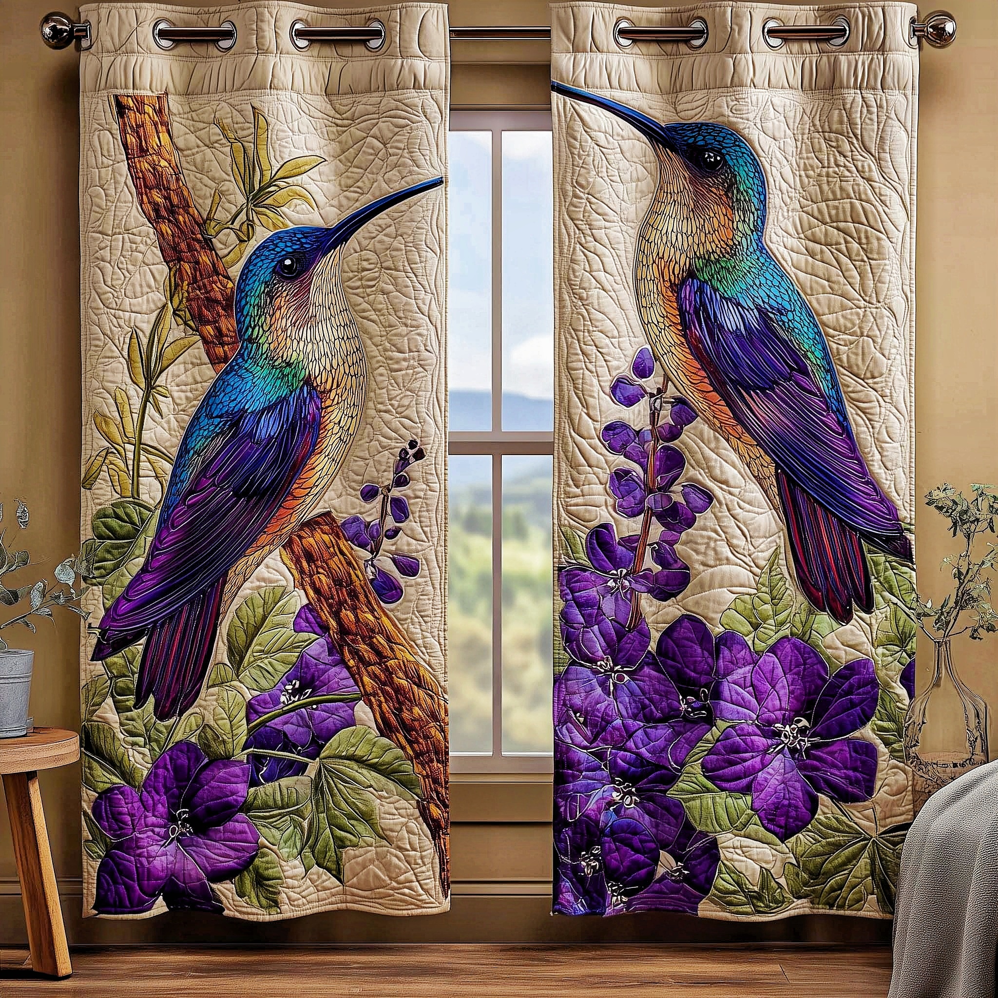 Hummingbird & Purple Floral Embroidered Knitwear Quilted Curtains