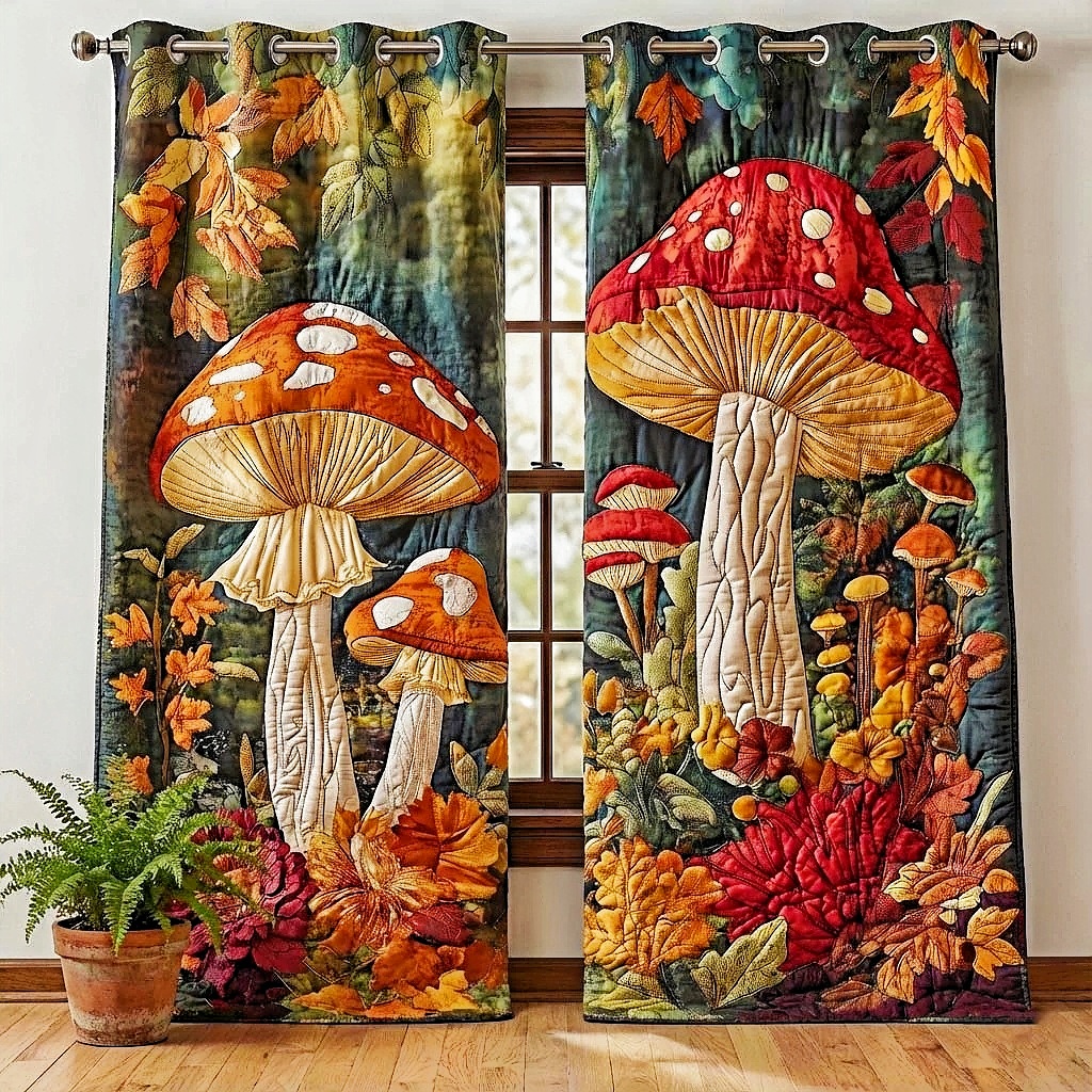 Autumn Mushroom & Fall Leaf Embroidered Knitwear Quilted Curtains